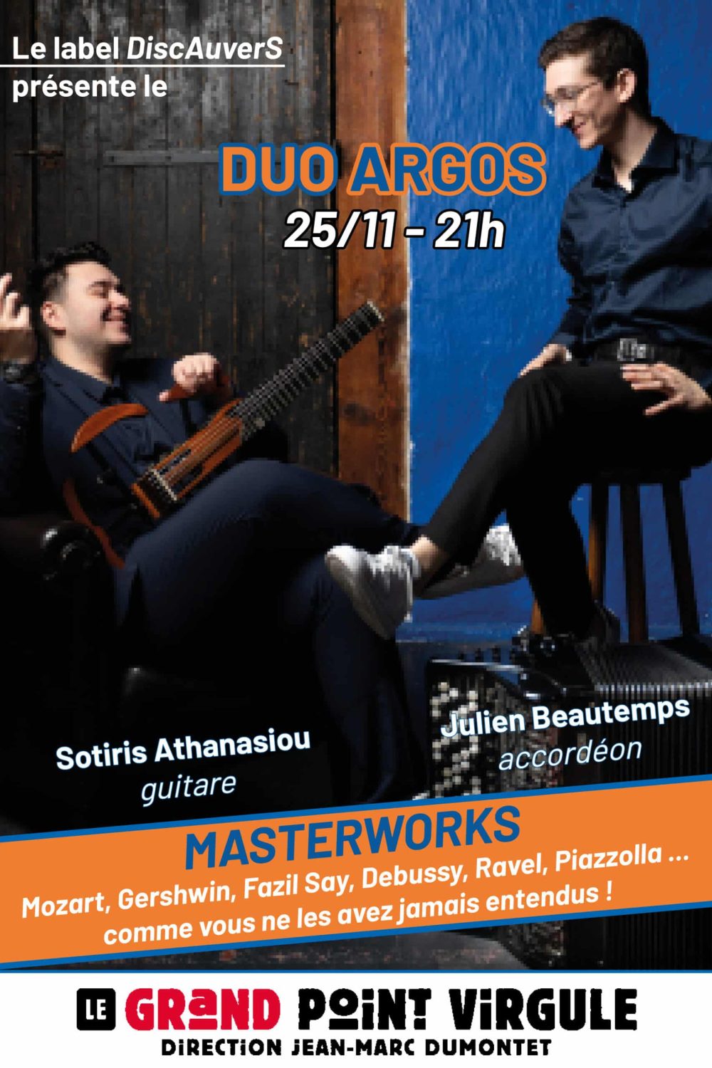 Ils forment un étonnant duo, témoignent d’une grande créativité et revisitent le répertoire classique avec un brin de folie. L’accordéoniste Julien Beautemps et le guitariste Sotiris Athanasiou seront en concert le au Grand Point Virgule. Ils y présenteront le programme de leur premier album à paraître en novembre sous le label DiscAuvers, dans lequel ils interprètent des transcriptions – ou plutôt recompositions – d’œuvre de Mozart, Gershwin, Ravel ou encore Piazzolla. Argos, c’est le nom qu’ils ont choisi pour leur duo qui flirte avec le jazz et prône le métissage culturel. Ils nous raconteront leur rencontre et leur démarche artistique placée sous le signe de la virtuosité, l’inventivité et l’humour !